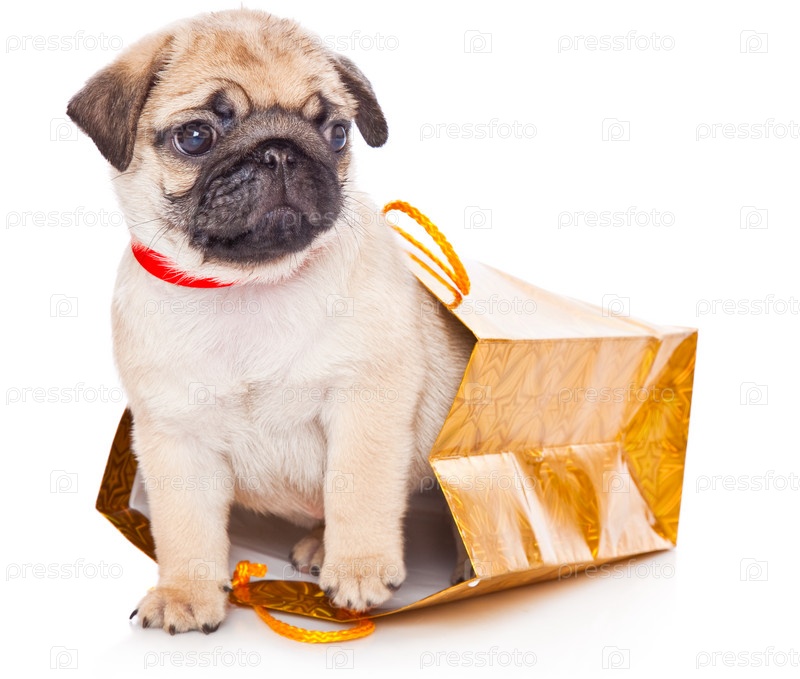 Щенок мопса в пакете на белом фоне