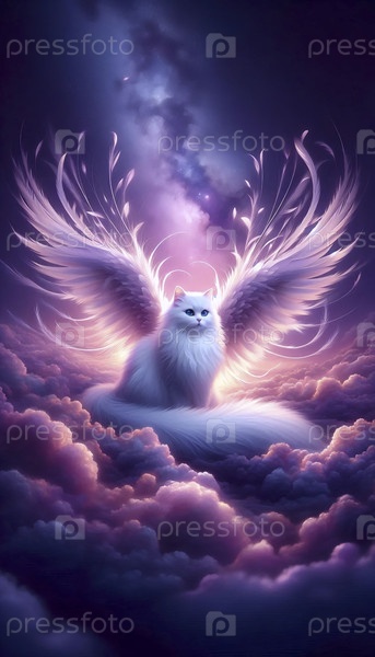 Ангел-кошка со светящимися крыльями цифровая живопись, Ai generated image