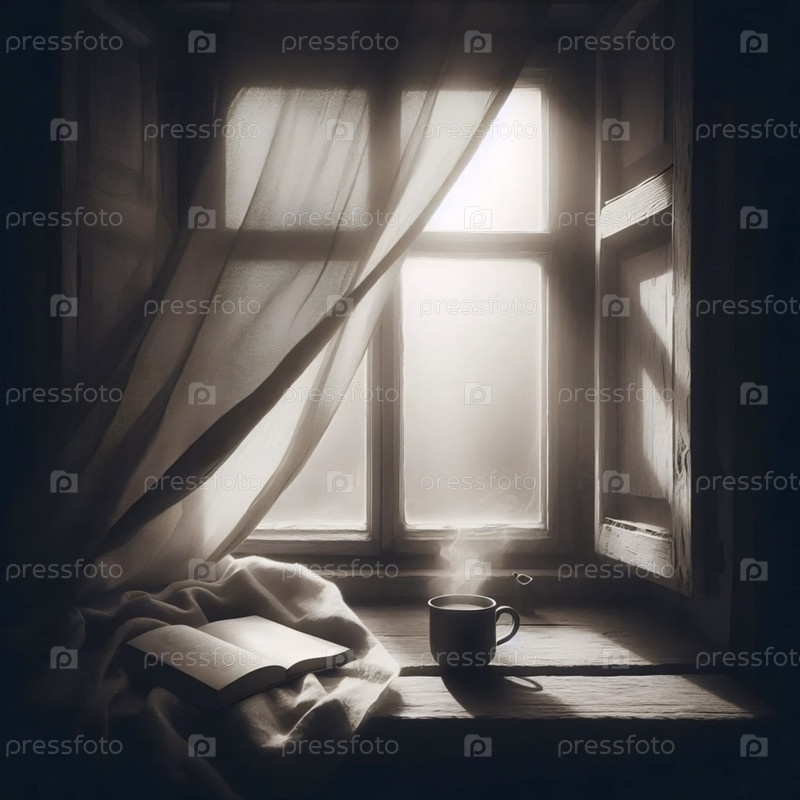 Пустое окно с чашкой кофе на рассвете, Ai generated image