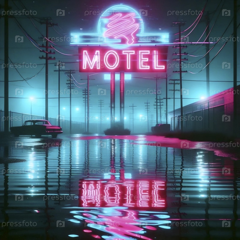 Блестящий неоновый мотель отражается в луже, Ai generated image