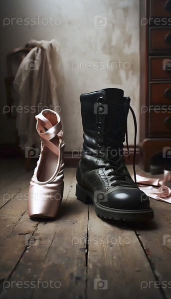 Балетные ботинки рядом с ортопедическими сапогами, Ai generated image