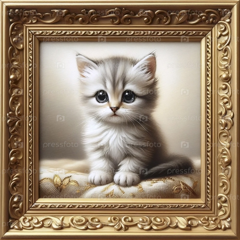 Небольшой портрет кота с золотой рамкой, масляная живопись, Ai generated image