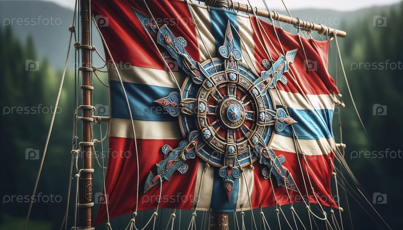 Норвежский флаг из элементов корабля викингов, Ai generated image A