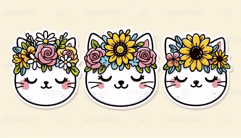 Милый лист наклейки с кошками с разными цветочными коронами, Ai generated image