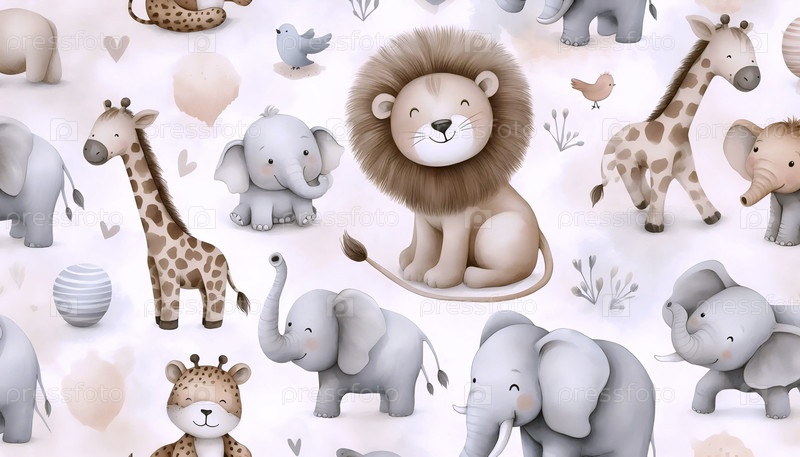 Акварель Африканский образец животного гендерно-нейтральный детский сад милый фон льва маленький слон, Ai generated image