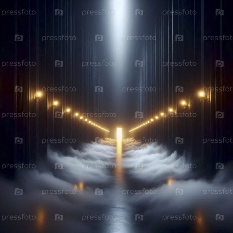Широкий снимок по длинному темному коридору в сторону светящейся двери, Ай создал изображение