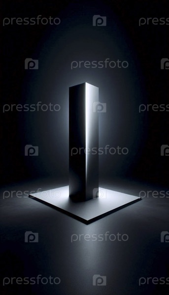Макет высокой матовой черной цилиндрической колонны в пустом темном пространстве, освещенный вертикальным разрезом света от скрытого источника