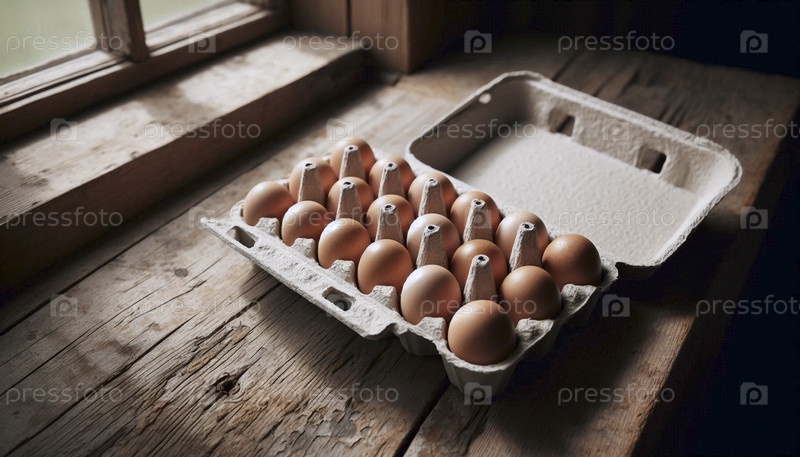 Пустой, сформированный макет картона из мягких яиц, открытый на деревенском кухонном столе, Ai generated image