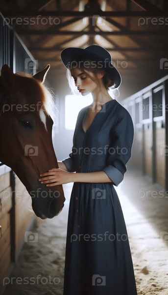 Женщина тренирует лошадь в джинсовом платье, Ai generated image