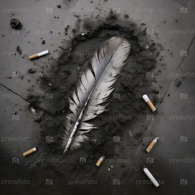 Широкий снимок крыши с перьями в фокусе, за ним городская туманность, Ай создал изображение