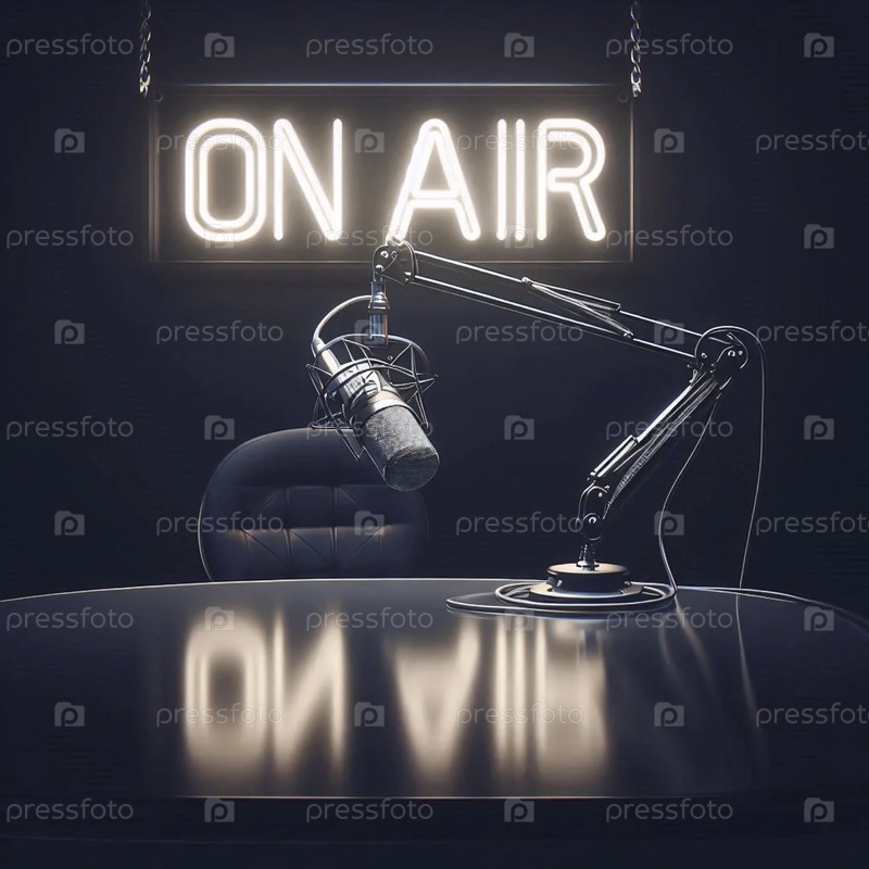 Мокет черного стеклянного стола с микрофоном в пустой руке, под светом пользовательского неонового знака "ON AIR" (выключенный), Ai создал изображение