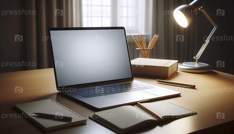 Мокет ноутбука с открытым пустым экраном на деревянном столе рядом с блокнотом, Ai generated image