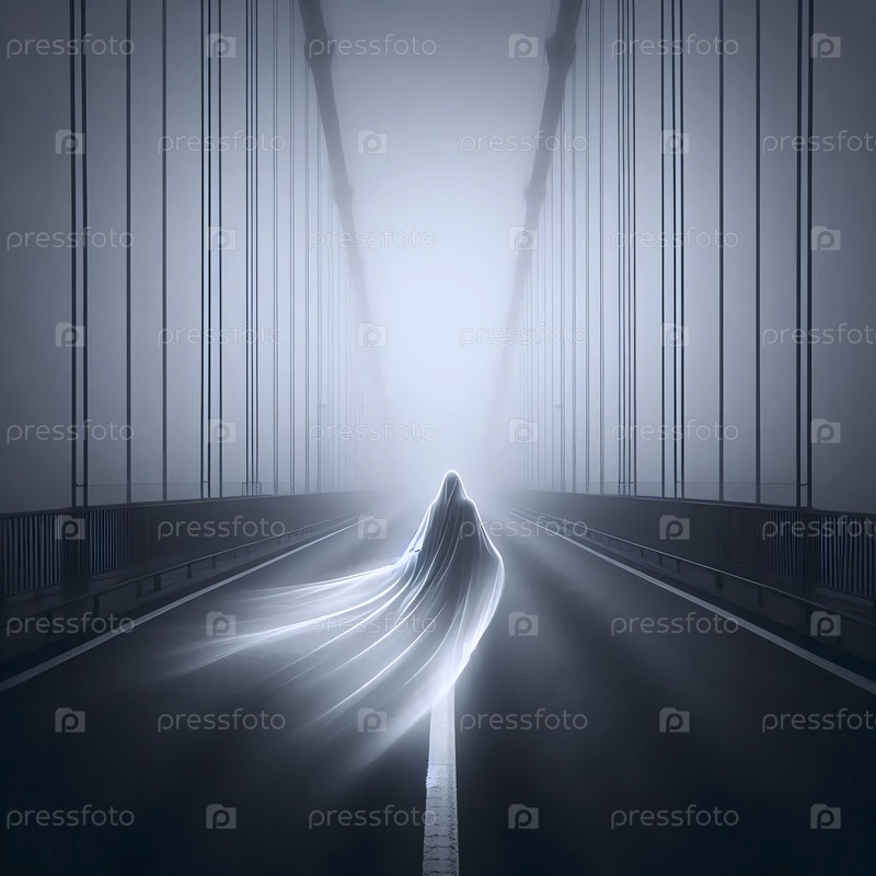 Фотография с длительной экспозицией, на которой фигура в капюшоне пересекает туманный мост, Ai generated image
