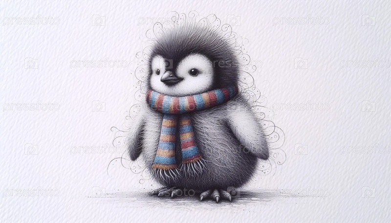 Ребенок пингвин с шарфом чернил рисует художественный принт, Ai generated image