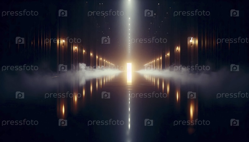 Широкий снимок по длинному темному коридору в сторону светящейся двери, Ай создал изображение