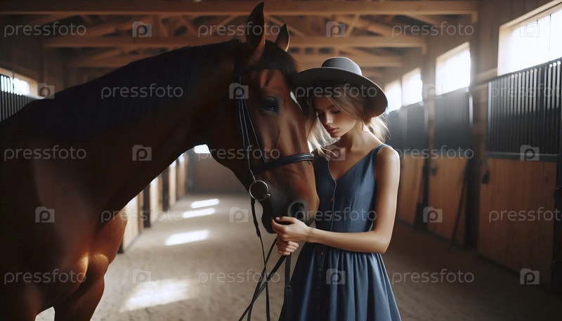 Женщина тренирует лошадь в джинсовом платье, Ai generated image