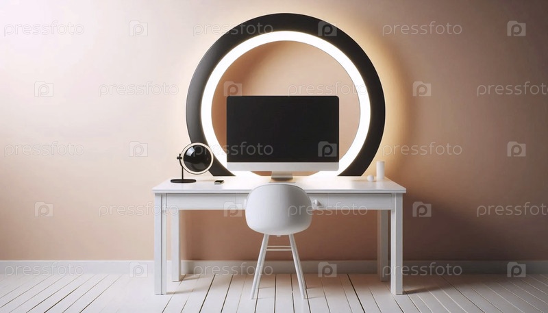 Минималистский белый макет рабочего стола с большим кольцевым светом, отражающимся на пустом экране монитора против пастельной стены, Ai создал изображение