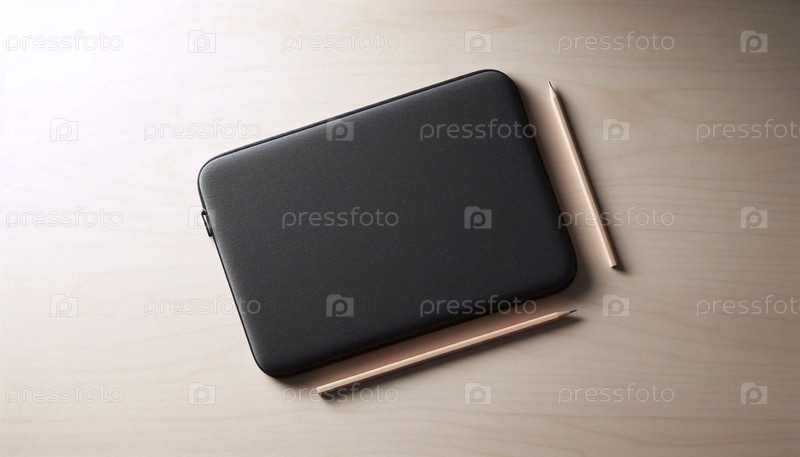 Макет тонкого неопрена для ноутбука в темно-сером цвете, на минималистичном столе, Ai generated image