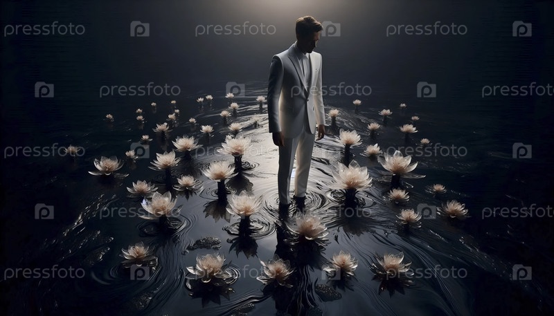 Жених в белом костюме, стоящий в черном масле, Ai generated image