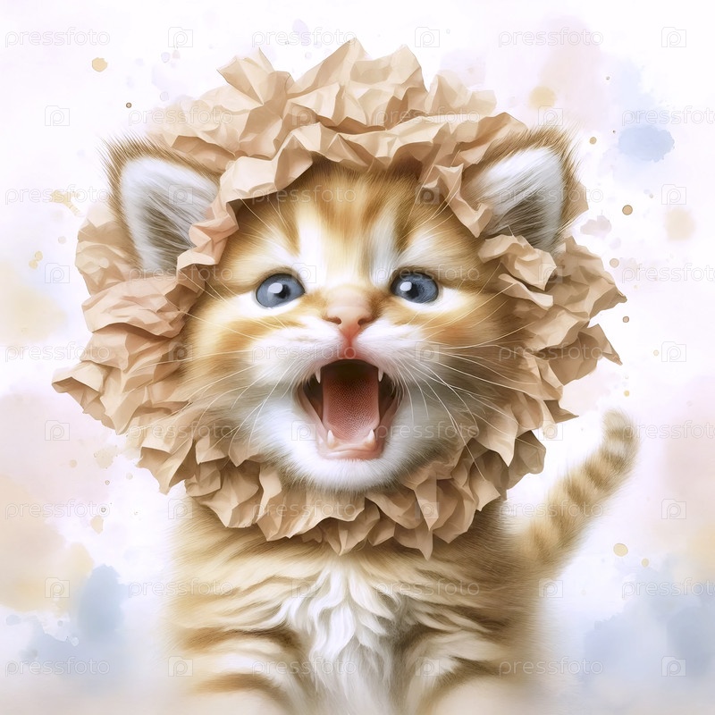 Котенок как маленький лев Акварельный художественный печат, Ai generated image