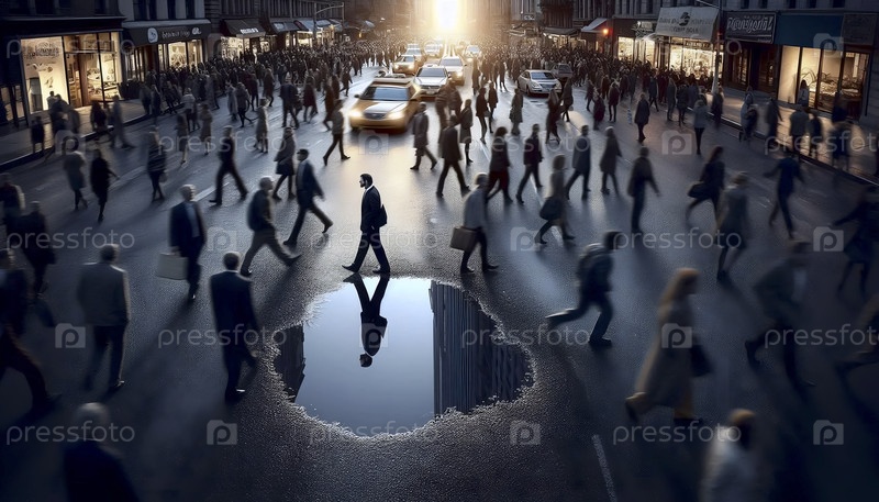 Крылья отражаются в луже у ног прохожих, которые их не видят, Ai generated image
