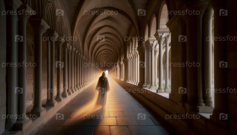 Фотография с длинной экспозицией монаха, идущего по монастырю, Ai generated image