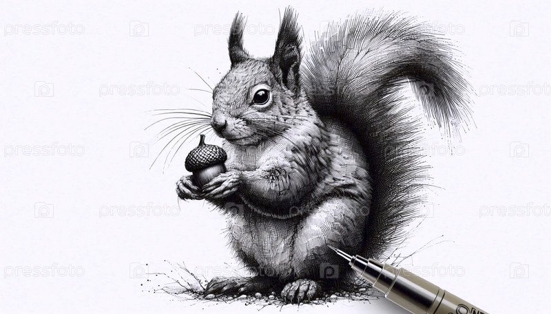 белка с чернильным рисунком ореха