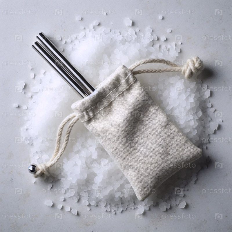 Мокет соломы из нержавеющей стали, спрятанный внутри небольшого льняного мешка с резьбой на веревке, на кровати морской соли, Ай создал изображение