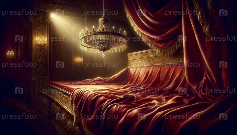Одинокий, пустой модельный экземпляр люстры с наручными серьгами, висящий из складки темно-красного бархатного бархата в оперной коробке, обтянутой бархатом, Ai generated image