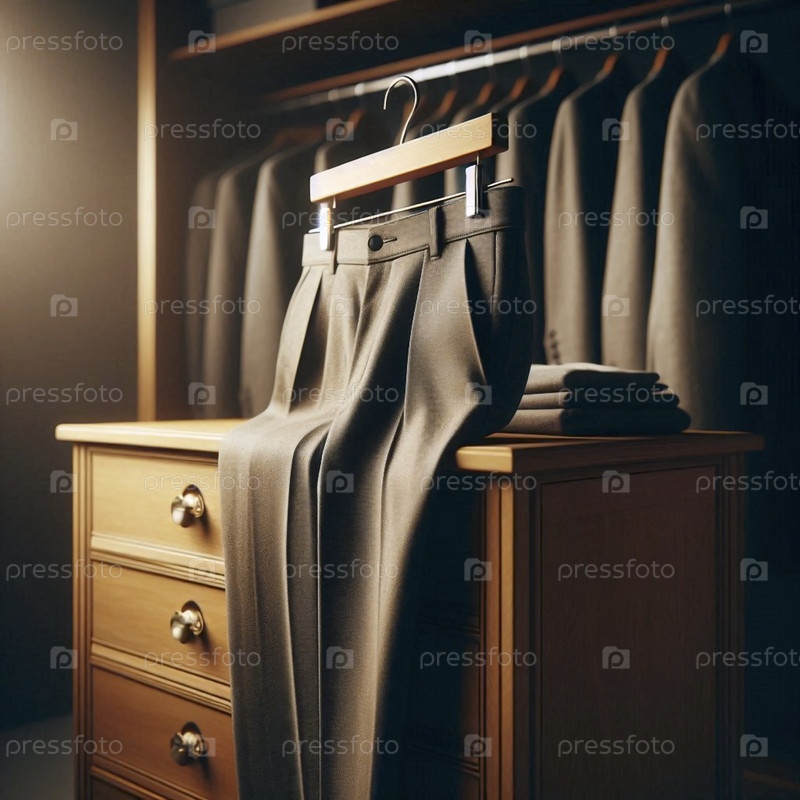Макет серых шерстяных брюк, аккуратно напечатанный и положенный над деревянным столом для валета, Ай создал изображение