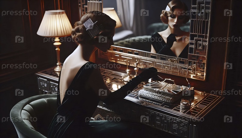 Женщина в черном бархатном платье с оболочкой на ар-деко суете, Ai generated image