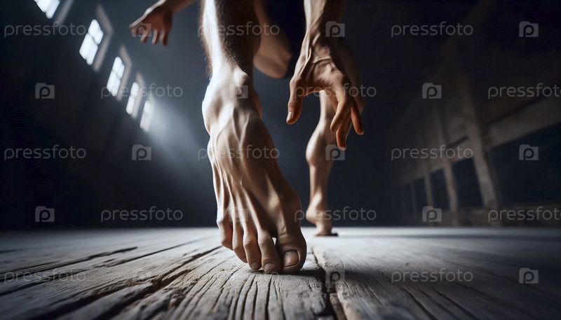 Снимок снизу, нога показывает на изношенном полу, подчеркивая нагрузку, Ai создал изображение