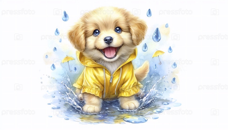 Щенок в дождевом пальто акварельный арт-принт, Ai generated image
