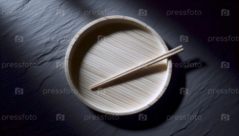 Круглый, пустой макет бамбуковой суши-платки со подставкой на палочках, на темной поверхности сланца, Ai generated image