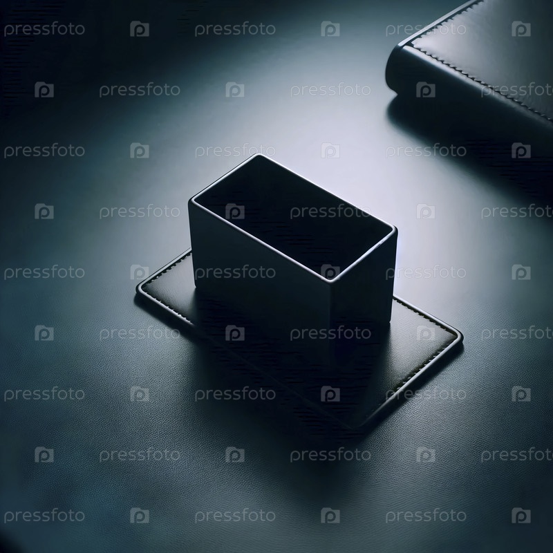 Матовый черный металлический макет держателя визитных карточек, пустой, на глубоком зеленоватом кожаном столовом блотере, Ai generated image