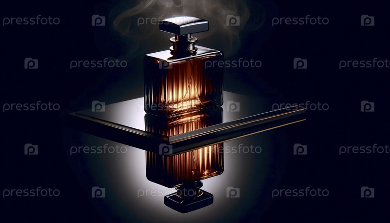 Мокет бутылки с парфюмом из темного копченого стекла на зеркальной подносе, Ai generated image