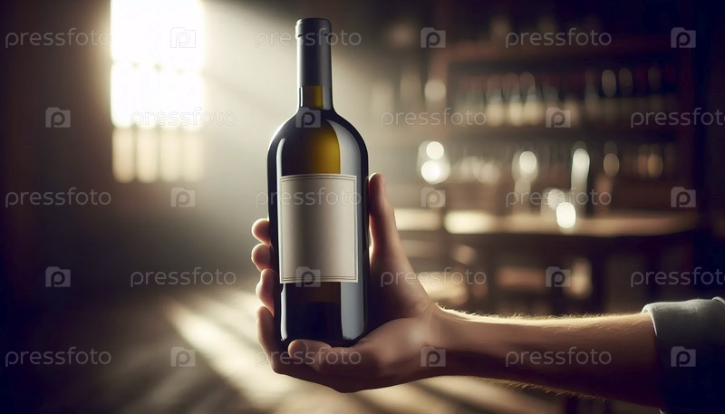 Пустая, прямоугольная область макета этикетки вина на плече прозрачной стеклянной бутылки с вином, удерживаемой в руке