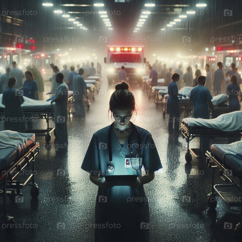Более широкий кинематографический снимок окружающей среды, сделанный в хаотичном, покрытом дождем отделении скорой помощи ночью, Ai создал изображение