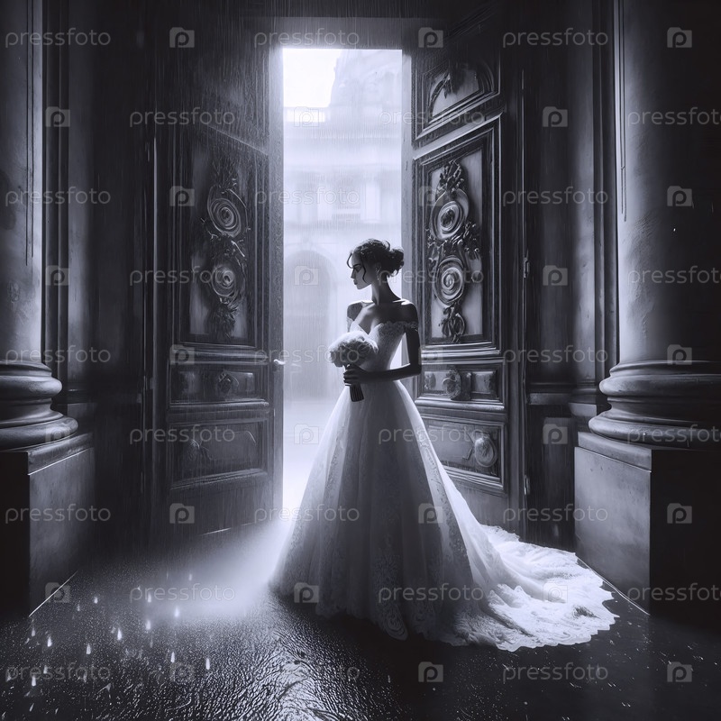 Невеста в пропитанном дождем городском подъезде, Ai generated image