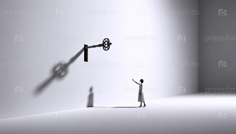 Женщина, держащая ключ против пустой стены, Ai generated image