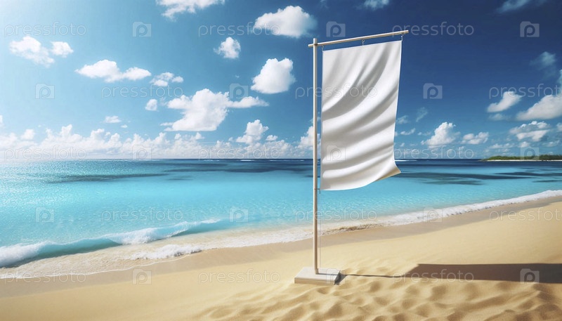 Большой самостоятельный макет баннера флага на песчаном пляже, белая ткань которого слегка размахивает против чистого синего неба и океана, Ai создал изображение
