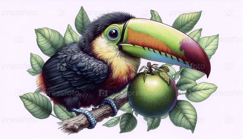Ребенок тукана с чернилами ягод рисует художественный принт, Ai generated image