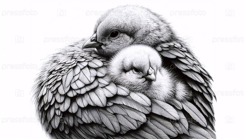Пушистая цыпленочка под крылом чернила рисование художественная печать, Ai generated image