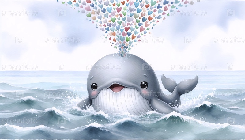 Little Whale Spouting Hearts Акварельный художественный печат, Ai generated image