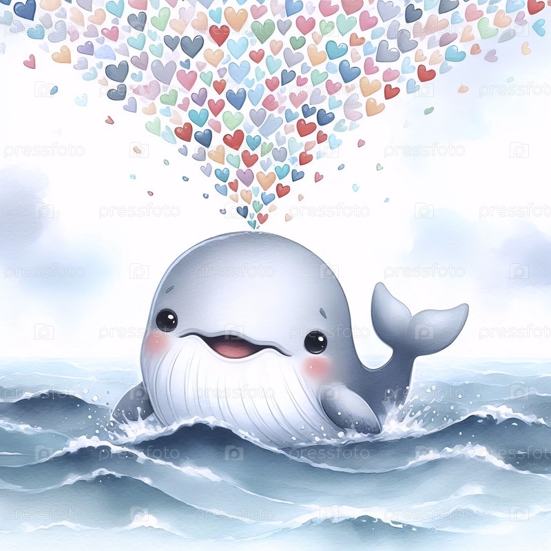 Little Whale Spouting Hearts Акварельный художественный печат, Ai generated image