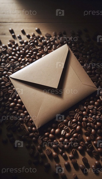 Мокет конверта из крафт-бумажной бумаги с пустым квадратом для адреса, лежащего на кровати свободных кофейных зерен, Ай создал изображение