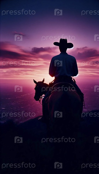 Силуэт одинокого всадника на холивудском закате, Ai generated image