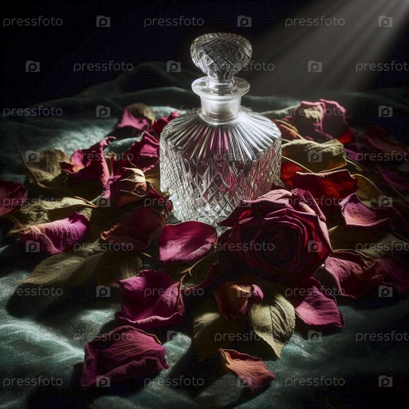 Макет пустой кристаллической бутылки, наполовину похороненной в постели сушеных листьев роз, Ai generated image