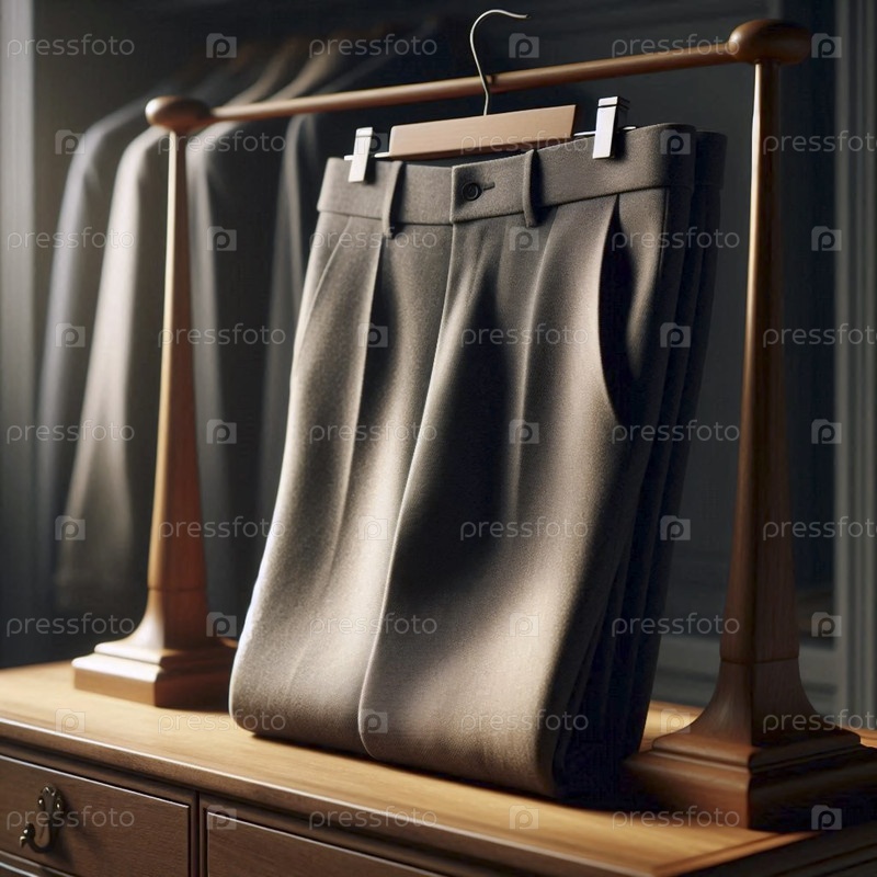 Макет серых шерстяных брюк, аккуратно напечатанный и положенный над деревянным столом для валета, Ай создал изображение