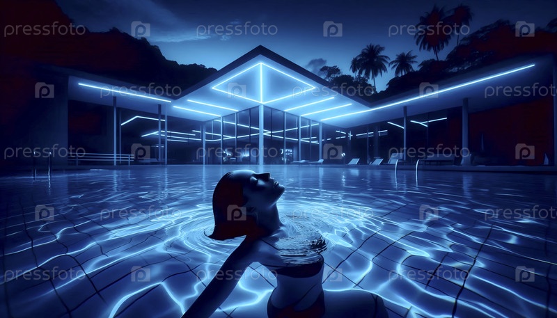 Женщина плавает в неоновом бассейне ночью, Ai generated image